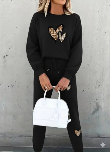 • Kadın uzun kollu bisiklet yaka kalp desenli şardonlu üç iplik bluz ve pantolon ikili takım