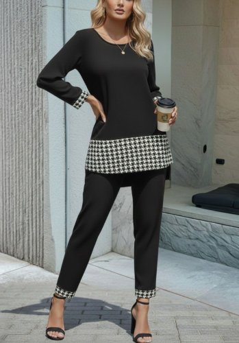 • Kadın uzun kollu yuvarlak yakalı kaz ayağı detaylı viskon iki iplik bluz ve pantolon ikili takım