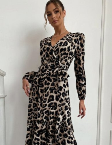 • Kadın uzun kollu kruvaze yaka yandan bağlamalı önden fırfır detaylı süprem uzun elbise