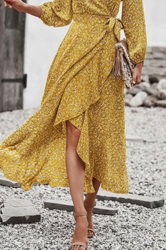 • Kadın uzun kollu kruvaze yaka yandan bağlamalı önden fırfır detaylı süprem uzun elbise